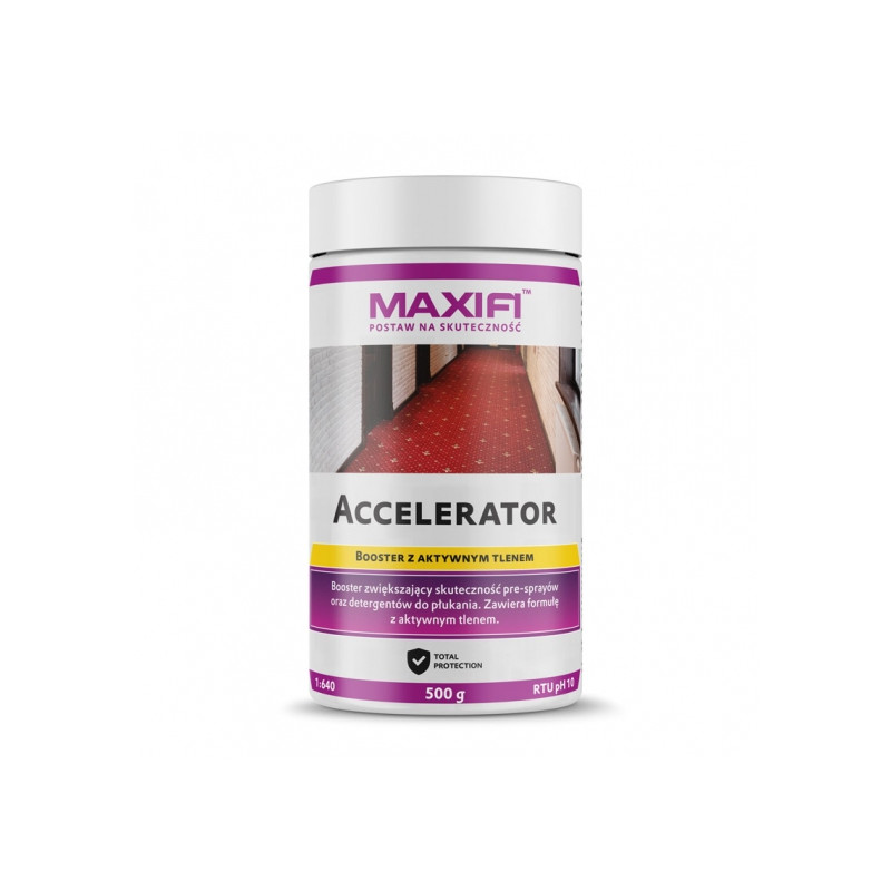 Maxifi Accelerator to wyjątowy produkt, który zwiększa efektywność prania dywanów, wykładzin i tapicerek. Można go stosować z każdym pre-sprayem oraz detergentem Maxifi. Znacząco podnosi skuteczność czyszczenia, usuwania plam oraz pomaga ożywić kolory pranych tkanin. Specjalna formuła zawiera aktywny tlen dla lepszej skuteczności, szczególnie na jasnych dywanach, wykładzinach i tapicerkach.