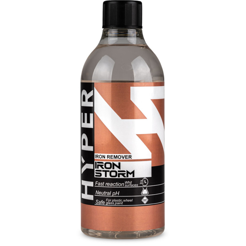 Hyper Iron Storm Iron Remover – produkt typu iron remover, gotowy do użycia. Neutralne pH produktu usuwa zanieczyszczenia pochodzenia metalicznego z lakieru, szkła, plastików, felg. Zaawansowana formuła natychmiast wchodzi w reakcje z osadami metalicznymi, rozpuszczając je na charakterystyczny kolor fioletowy. Zawarte w składzie środki powierzchniowo-czynne ułatwiają spłukanie produktu za pomocą myjki ciśnieniowej. Jako nieliczny nie posiada przykrego zapachu "zgniłego jajka", który jest charakterystyczny dla tego typu produktów.