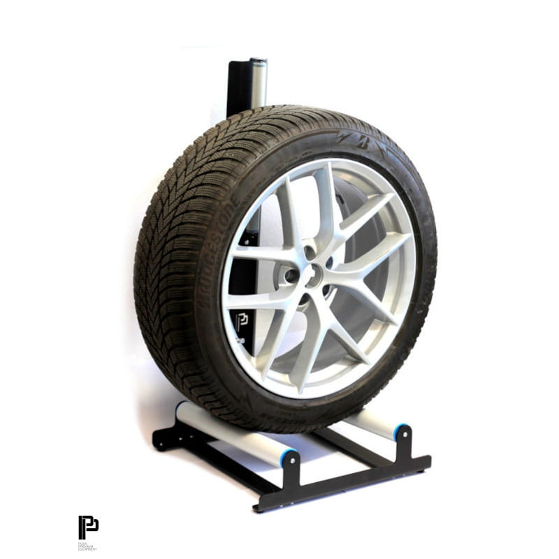 Stojak wykonany jest z wysokiej jakości, wytrzymałej 4 mm czarnej stali, precyzyjnie wyciętej i wygiętej, finalnie pokrytej proszkowym wykończeniem, zarówno wewnątrz jak i zewnątrz, aby zapewnić dodatkową warstwę ochronną przed utlenianiem. Dolne rolki o długości 420 mm oraz górna o długości 400 mm (łączna długość pałąka 900 mm) dopasują się do szerokich felg w rozmiarze od 14” do 22”. Wysokiej jakości gumowe nóżki utrzymają stojak w jednej pozycji podczas całej pracy. Dzięki specjalnym, tylnym zagięciom pałąk jest bardzo stabilny nawet przy masywnych kołach.