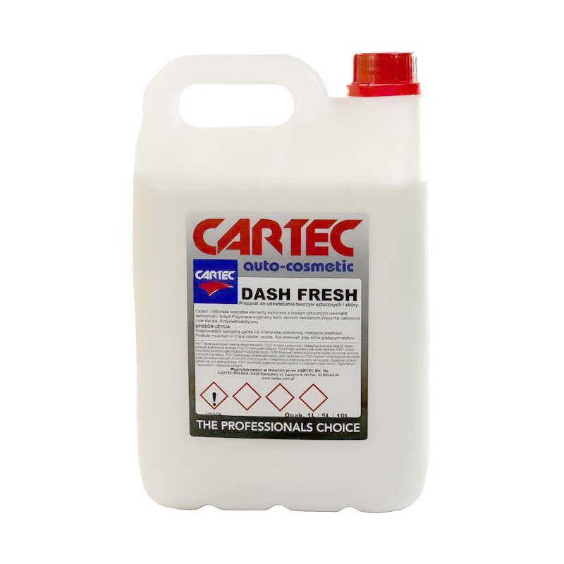 Cartec Dash Fresh – produkt do odświeżania tworzyw sztucznych. Preparat w formie mleczka przeznaczony do odświeżania tworzyw sztucznych. Przywraca pierwotny kolor i zabezpiecza je przed szkodliwym promieniowaniem UV. Doskonale chroni przed wnikaniem brudu i pozostawia przyjemny zapach. Nie klei się, całkowicie wysycha i posiada właściwości antystatyczne, co ułatwia utrzymanie czystości. Dołączony do butelki spryskiwacz zapewnia wydajną i łatwą aplikację preparatu.