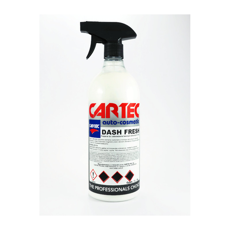 Cartec Dash Fresh – produkt do odświeżania tworzyw sztucznych. Preparat w formie mleczka przeznaczony do odświeżania tworzyw sztucznych. Przywraca pierwotny kolor i zabezpiecza je przed szkodliwym promieniowaniem UV. Doskonale chroni przed wnikaniem brudu i pozostawia przyjemny zapach. Nie klei się, całkowicie wysycha i posiada właściwości antystatyczne, co ułatwia utrzymanie czystości. Dołączony do butelki spryskiwacz zapewnia wydajną i łatwą aplikację preparatu.