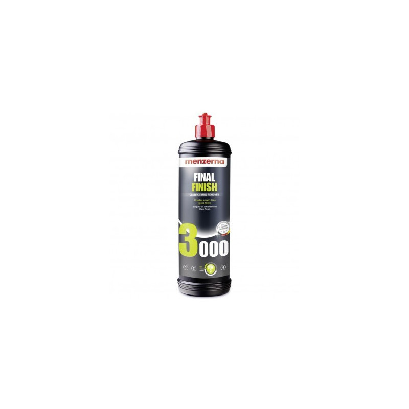 Menzerna Final Finish 3000 to lekkościerna, wykończeniowa pasta polerska nadająca powierzchni lakieru niebywałego połysku. Skutecznie niweluje niewielkie defekty lakieru, takie jak delikatne zarysowania, hologramy. Usuwa szlif o granulacji 3000.