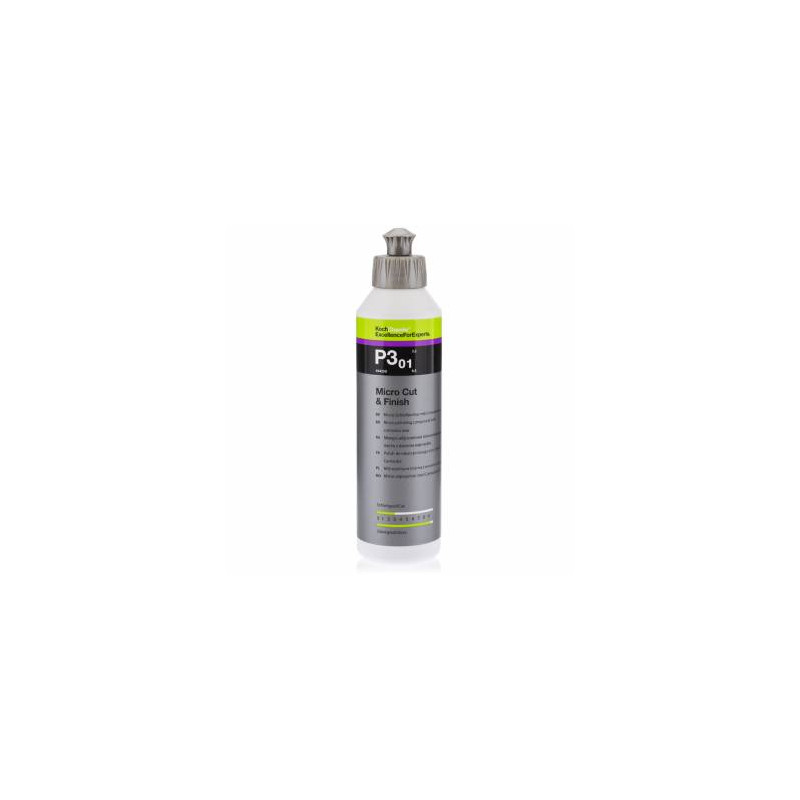 Koch Chemie P3.01 Micro Cut & Finish jest najnowszej generacji pastą polerską przeznaczoną do trwałego usuwania smug, hologramów, drobnych rys i śladów po matowaniu o gradacji P3000 z wszystkich lakierów (w tym odpornych na zarysowania) przy jednoczesnym długotrwałym zabezpieczeniu z wysokim stopniem połysku i gładkością wykończenia. Dzięki zastosowaniu wysoce wyspecjalizowanym, bardzo jednorodnym cząsteczkom ściernym zapewnia genialnie trwałe wykończenie o wysokim połysku. Hologramy i drobne zadrapania są usuwane mechanicznie, a nie, jak często przez maskowanie rys na powierzchni. Micro Cut & Finish jest ekonomiczną, łatwą w polerowaniu i usuwaniu mikro-politurą. Zawiera wosk carnauba i nie utleniające się silikony.