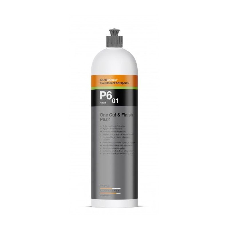 Koch Chemie One Cut & Finish P6.01 – to pasta polerska do jednoetapowej korekty lakieru, która usuwa zarysowania lakieru oraz ślady po papierze ściernym o gradacji powyżej P2000. Produkt zapewnia wykończenie na wysoki połysk i dodatkowo zabezpiecza lakier.