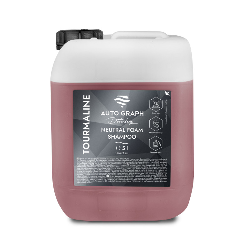 Auto Graph Tourmaline – to silnie skoncentrowany szampon o neutralnym pH do mycia i pianowania samochodów. Z łatwością usuwa brud, odtłuszcza i nabłyszcza lakier. Czyści delikatnie, ale zarazem efektywnie. Bardzo łatwy do wypłukania. Zalecane dawkowanie 25-50 ml / 10 L wody. W roztworze 2% może być stosowany jako piana. Z Tourmaline nie ma nudy – paleta kolorów i zapachów do wyboru!