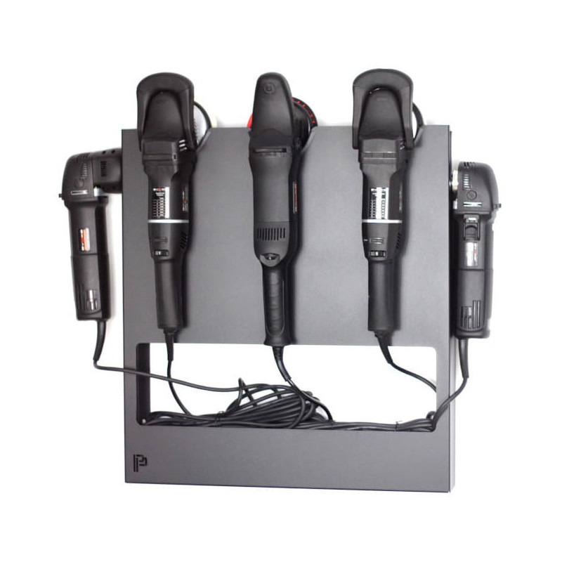 Nasz wieszak może bezpiecznie pomieścić trzy do pięciu maszyn polerskich, umiejętnie ukrywając ich kable w specjalnym schowku. Wykonany z wysokiej jakości wytrzymałej stali, precyzyjnie wycięty i wygięty, finalnie pokryty proszkowym wykończeniem, zarówno wewnątrz jak i zewnątrz, aby zapewnić dodatkową warstwę ochronną przed utlenianiem.